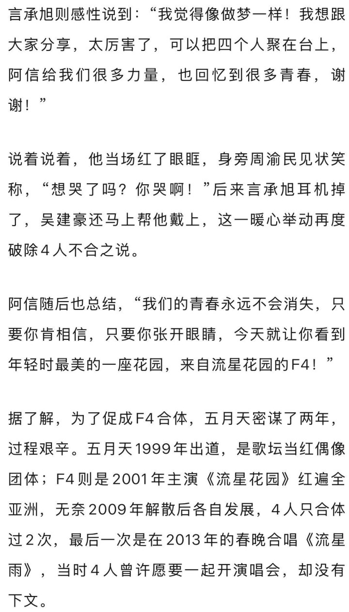 唱完《流星雨》后,4人轮流分享感想。朱孝天则感动表示,他唱完歌后有松了一口气的感觉,“因为前阵子一直在装傻,谁问我都说跟他们不熟,今天过了终于不用再装傻了。”